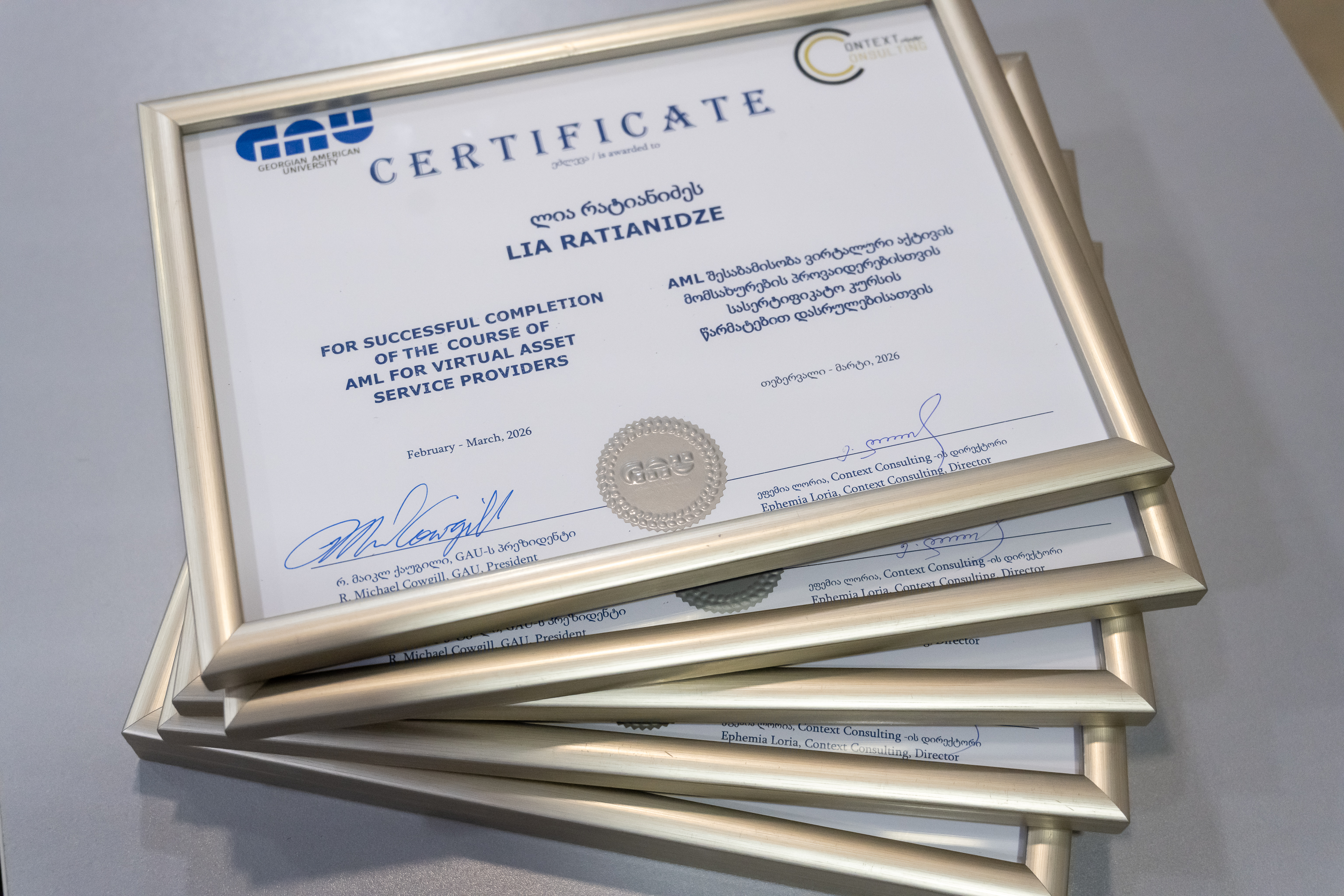 9 მარტს (2026) ფულის გათეთრების აღკვეთის ღონისძიებების შემსწავლელი სასერტიფიკატო კურსის (AML) მე-13 ნაკადის გამოსაშვები ცერემონია გაიმართა. დიპლომების გადაცემის ცერემონიალს კურსის ლექტორები ეფემია ლორია და თამარ რატიანიძე, ასევე უწყვეტი განათლებისა და სერტიფიცირების ცენტრის ხელმძღვანელი, თამთა ნიშნიანიძე ესწრებოდნენ.
