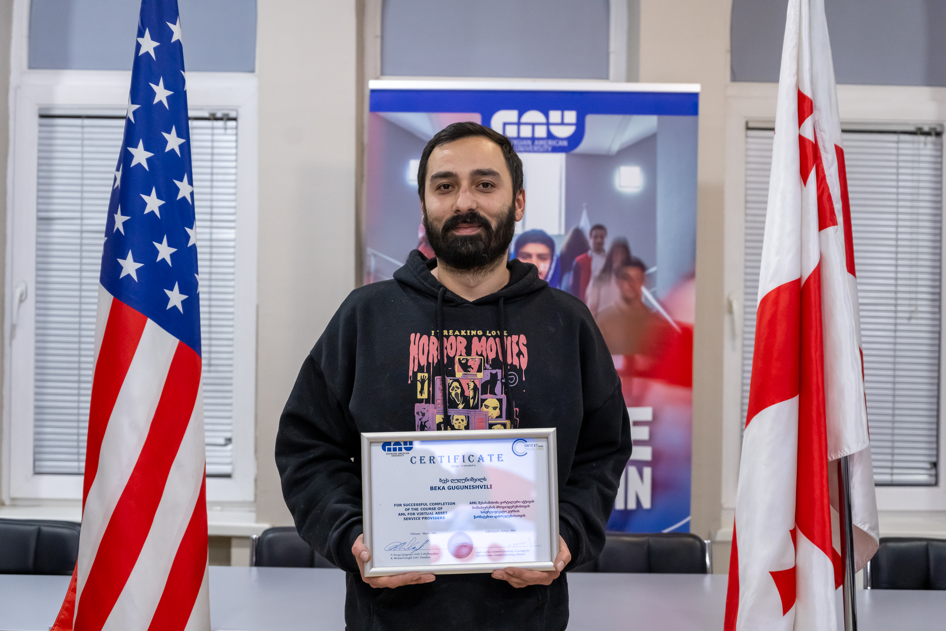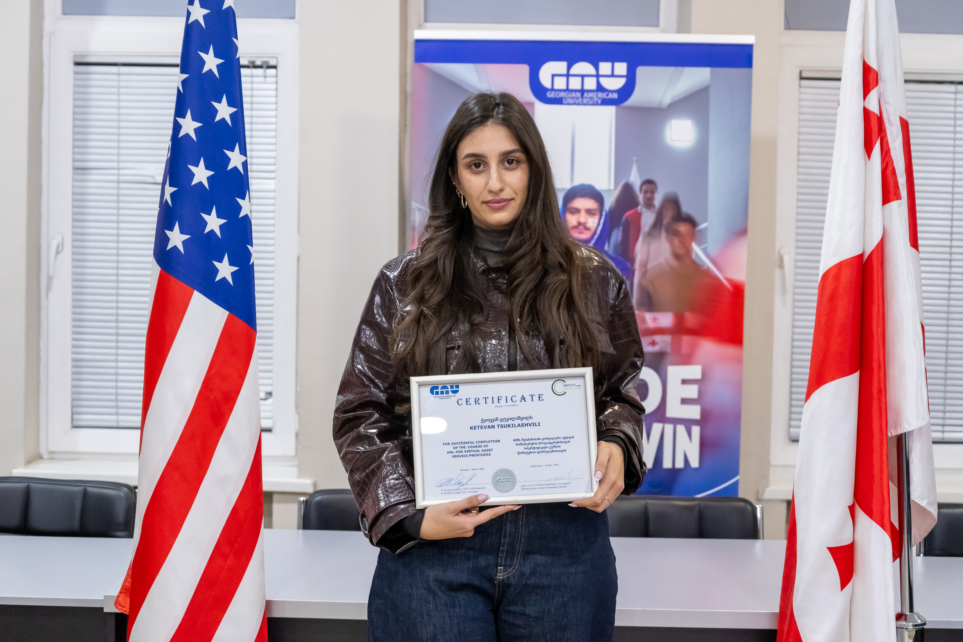 9 მარტს (2026) ფულის გათეთრების აღკვეთის ღონისძიებების შემსწავლელი სასერტიფიკატო კურსის (AML) მე-13 ნაკადის გამოსაშვები ცერემონია გაიმართა. დიპლომების გადაცემის ცერემონიალს კურსის ლექტორები ეფემია ლორია და თამარ რატიანიძე, ასევე უწყვეტი განათლებისა და სერტიფიცირების ცენტრის ხელმძღვანელი, თამთა ნიშნიანიძე ესწრებოდნენ.