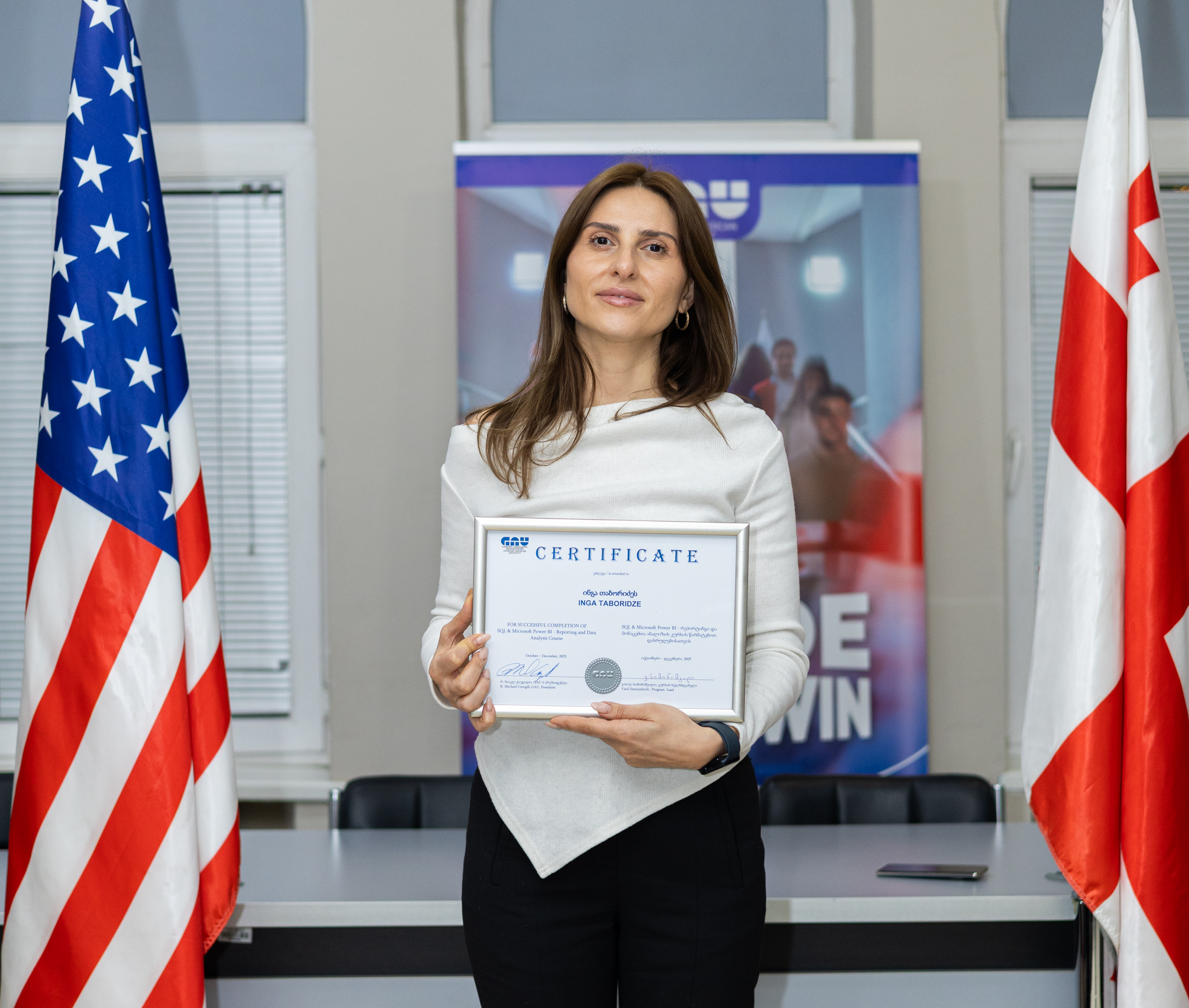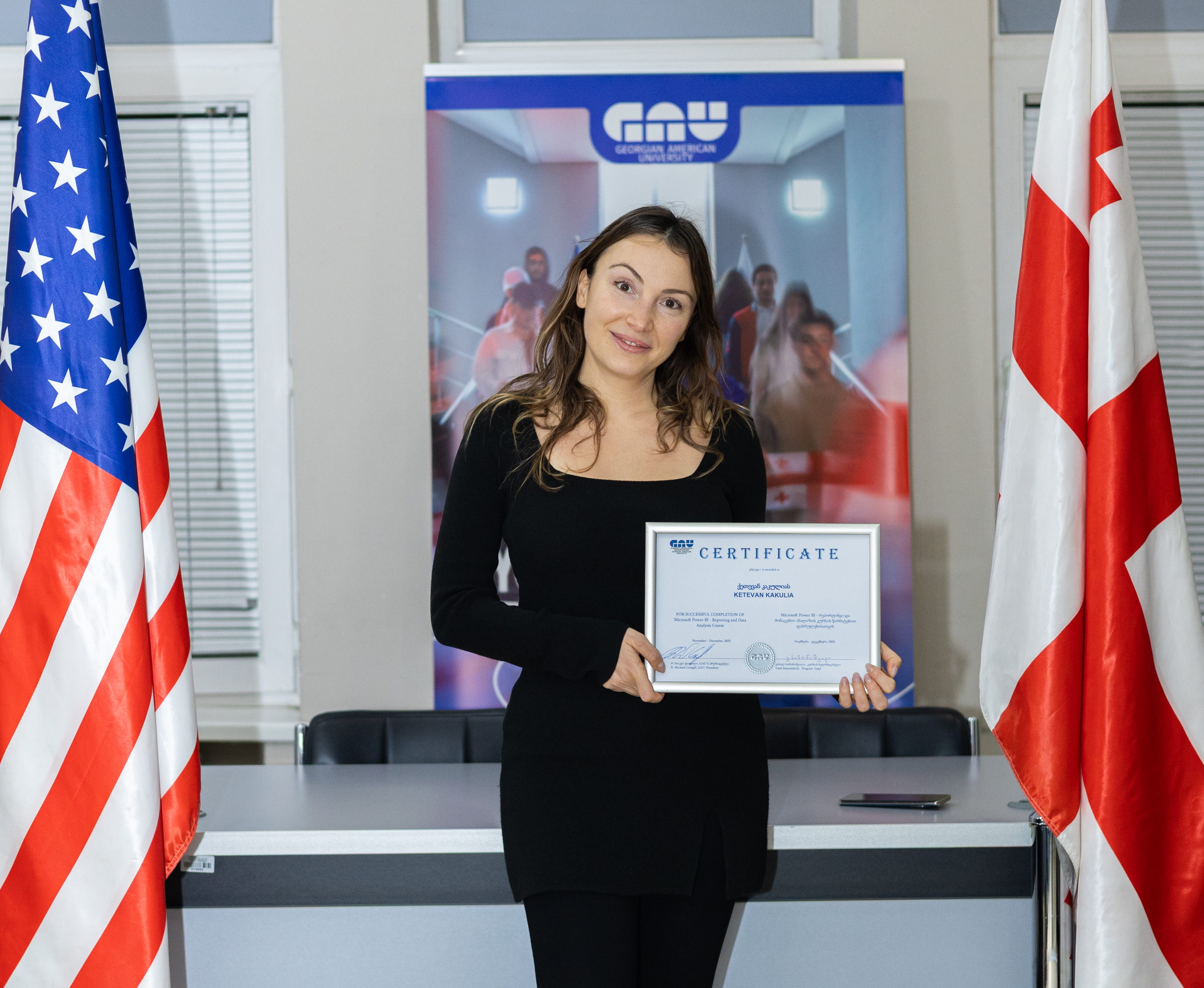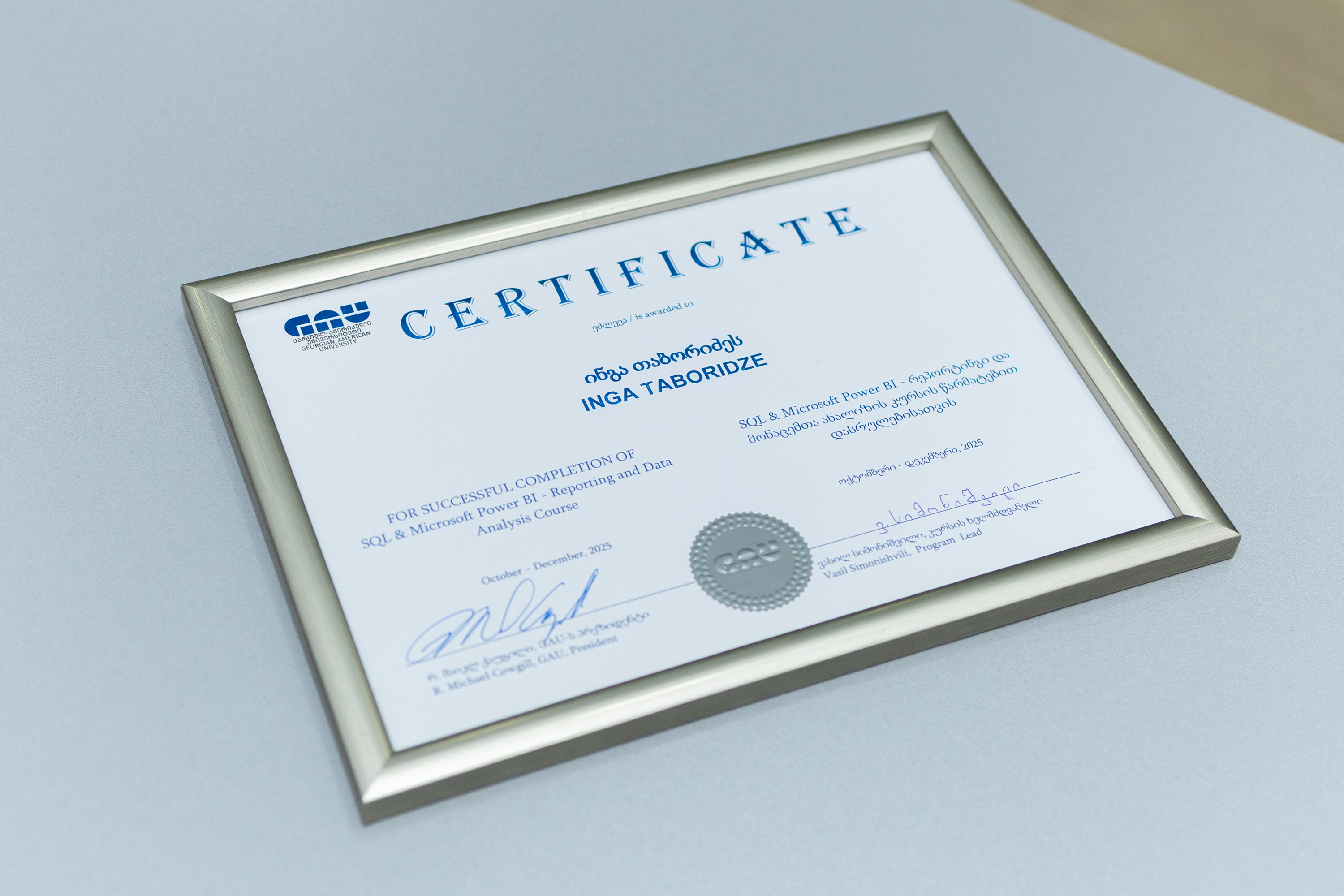 30 დეკემბერს (2025) Microsoft Power BI - რეპორტინგი და მონაცემთა ანალიზი კურსის I და II ნაკადების გამოსაშვები ღონისძიება გაიმართა. დიპლომების გადაცემის ცერემონიალს კურსის ხელმძღვანელი და ლექტორი ვასილ სიმონიშვილი და უწყვეტი განათლებისა და სერტიფიცირების ცენტრის ხელმძღვანელი თამთა ნიშნიანიძე დაესწრნენ.